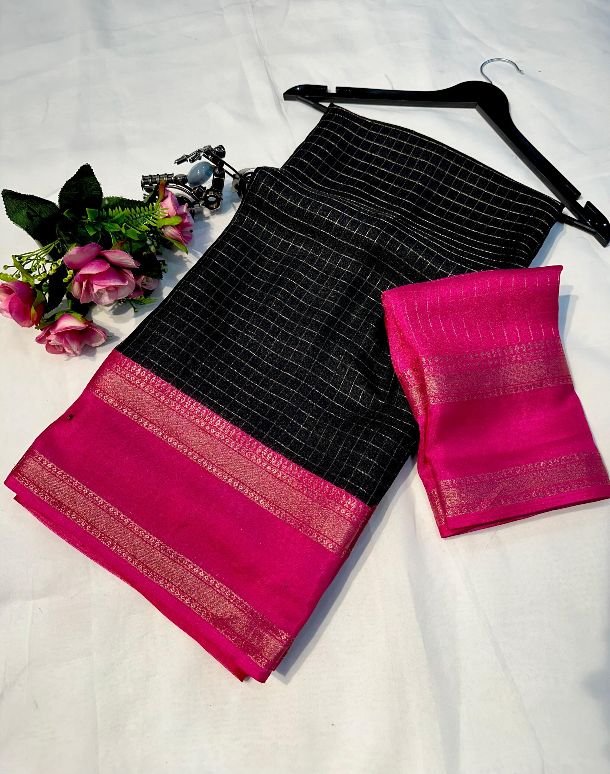 Beautiful heavy Mysore Silk saree, featuring a classic black base enhanced by a striking pink two-tone padding border